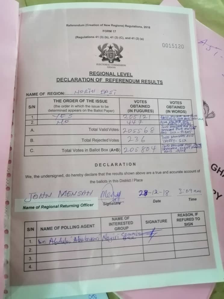 Residents in the North East area of the Northern Region have voted massively in support of the creation of the new North East region.