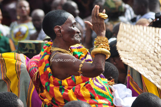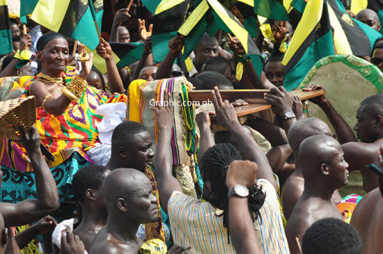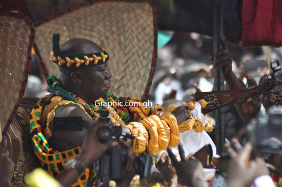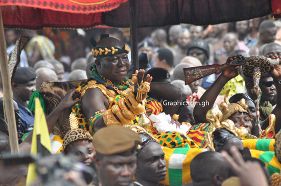 The huge gathering burst into cheers when Otumfuo Osei Tutu, awash with pure gold, rode majestically in a palanquin from Apagyafiem to the durbar grounds, a distance of about 1km amid the firing of muskets.