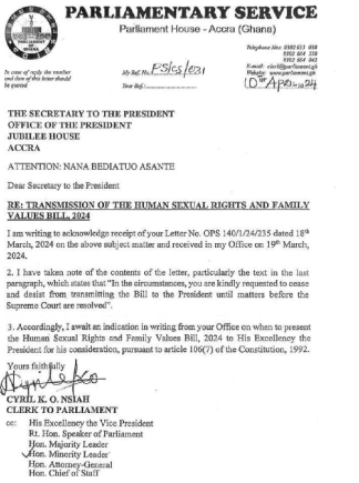 The Clerk of Parliament in its response to the President's Secretary's March letter said "I await an indication in writing from your Office on when to present the Human Sexual Rights and Family Values Bill, 2024 to His Excellency the President for his consideration, pursuant to article 106 (7) of the Constitution, 1992."
