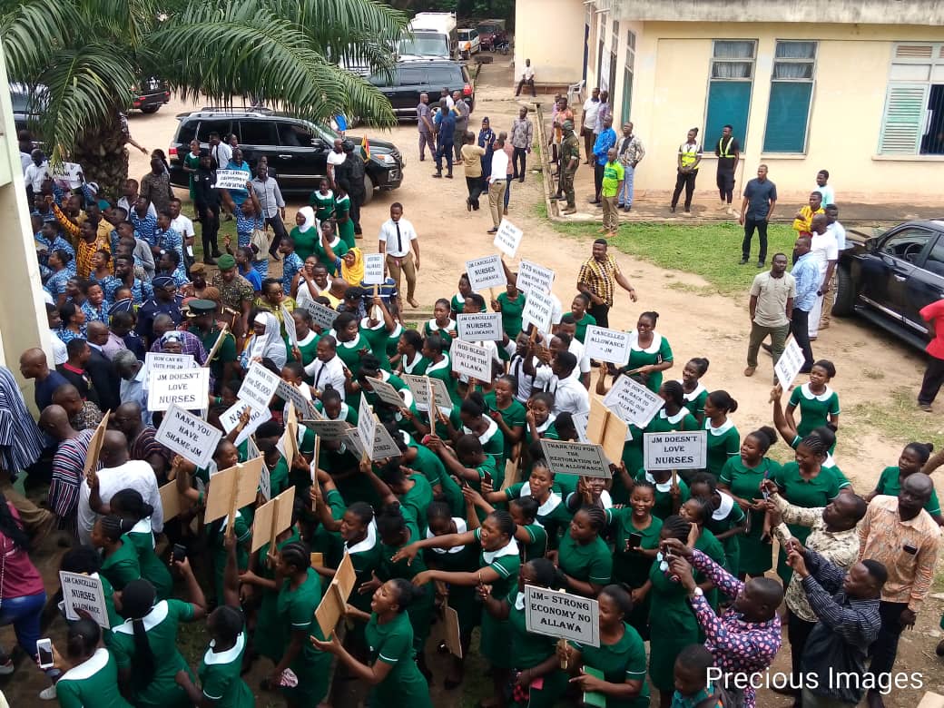 He was met at the forecourt of the Regional House of Chiefs by placard bearing student nurses, a cross-section of the people amid chants, drumming and singing.