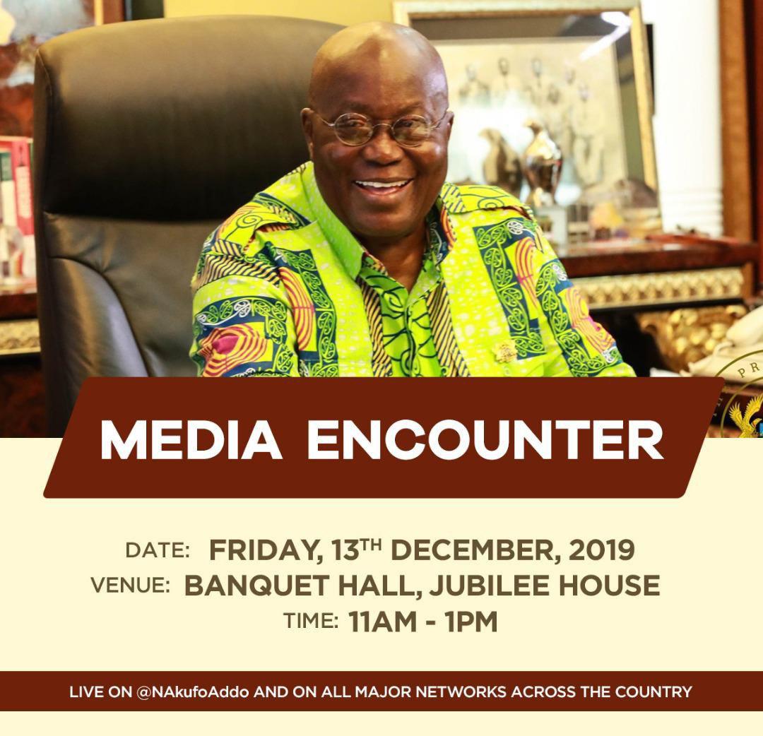 President Nana Addo Dankwa Akufo-Addo will hold a media encounter on Friday, December 13, 2019 to account for his three-year stewardship to Ghanaians.