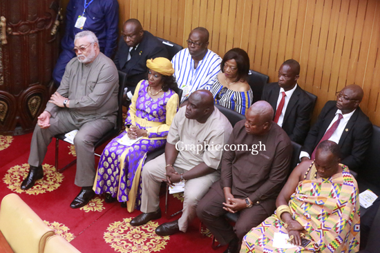 Former President Rawlings (L) with his wife Nana Konadu Agyemang Rawlings, former Chief of Staff Julius Debrah, former President John Mahama and the Chairman of the Council of State, Nana Otuo Siriboe at the chamber of Parliament on Thursday morning during the SONA. Pictures by SAMUEL TEI ADANO and EMMANUEL ASAMOAH ADDAI.