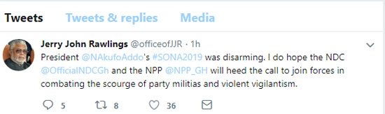 In a tweet reacting to the address, Mr Rawlings expressed the hope that the opposition National Democratic Congress (NDC) and the ruling New Patriotic Party (NPP) will join forces to disband political vigilantism which was on the increase.