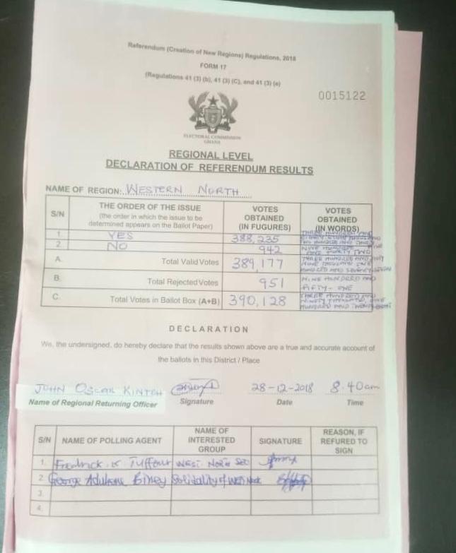 The proposal to create a Western North region out of the Western Region, has received a massive endorsement with 99.52 per cent of the people in the area voting YES in the referendum in support of the proposal.