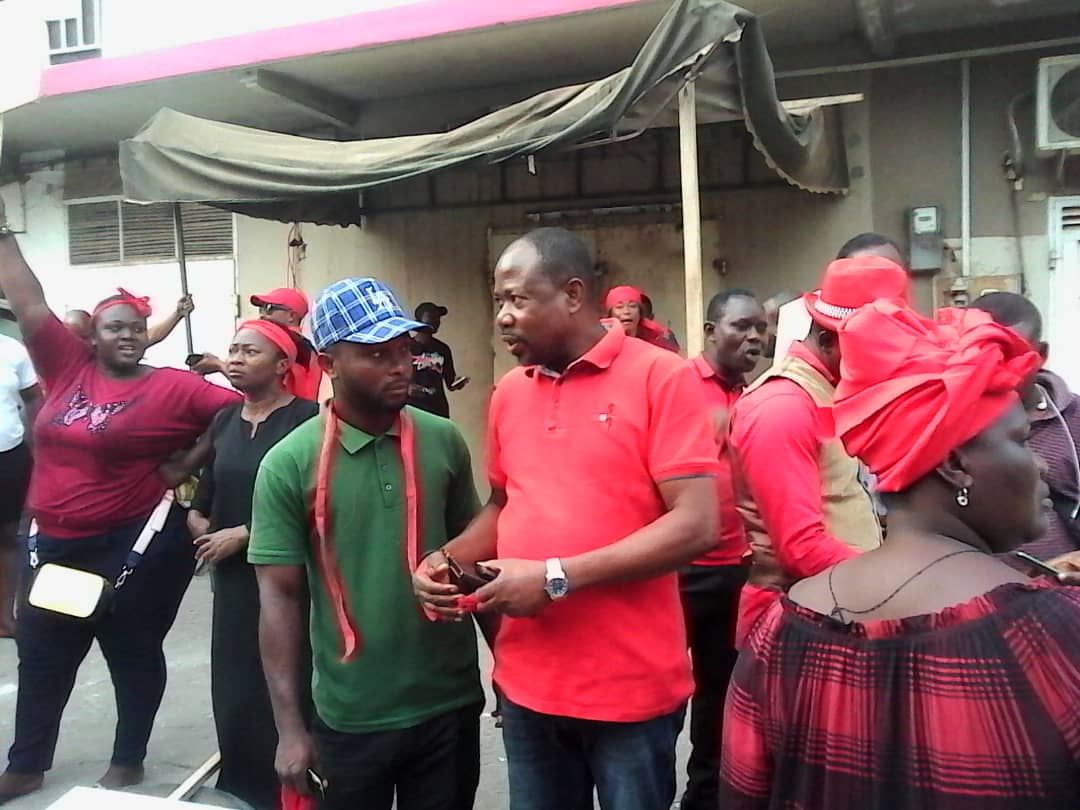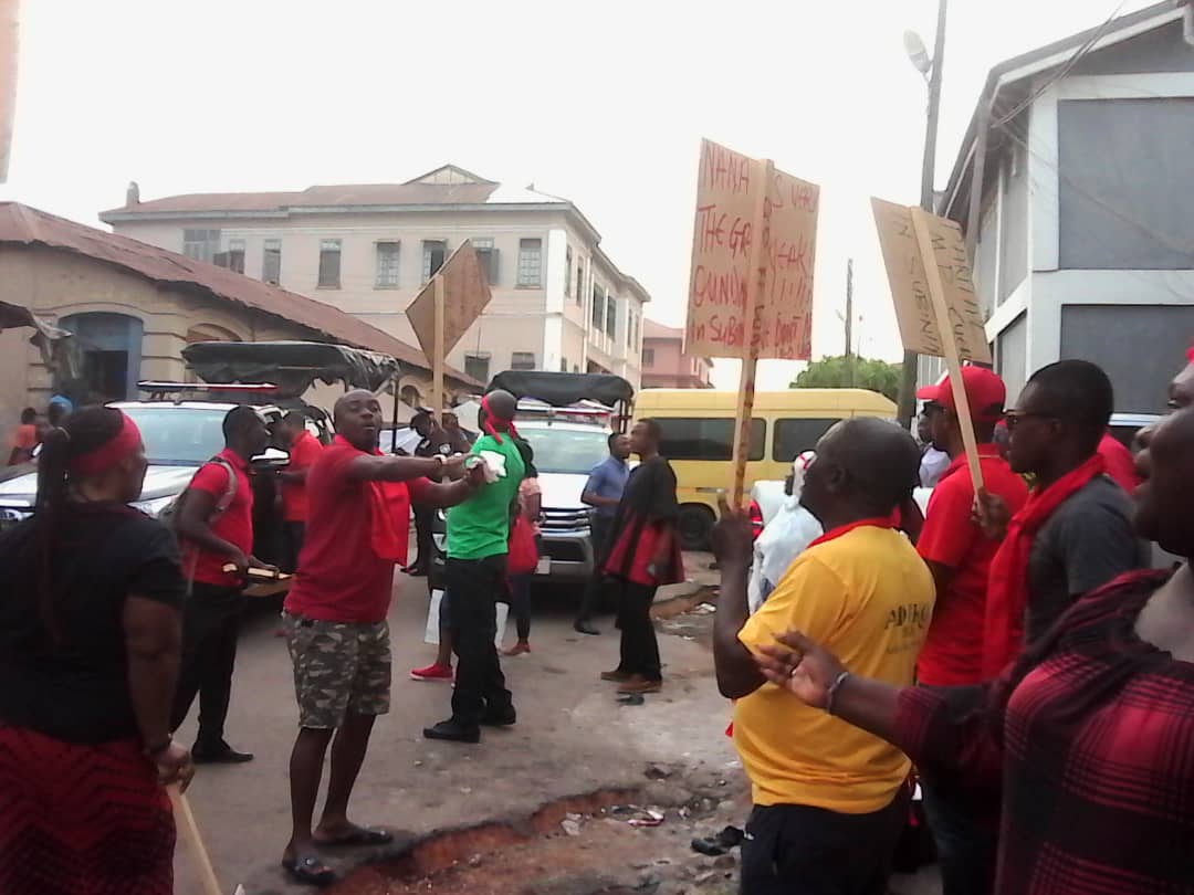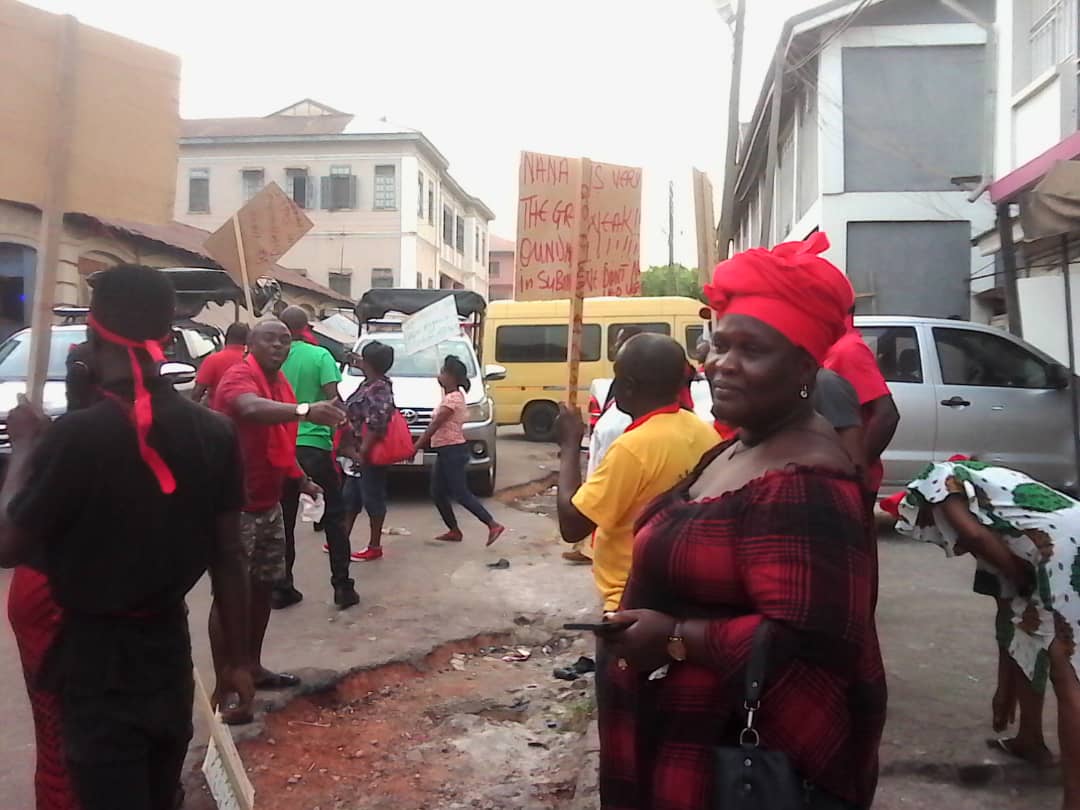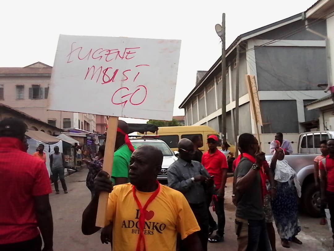 Wearing red armbands with placards some of which red, ‘Eugene Must Go’, ‘We Want Our Money’ and holding chains and padlocks, the ‘demonstrators’ tried to lock up the party office but were stopped by the police who were called in to provide security.