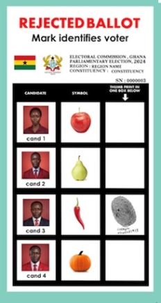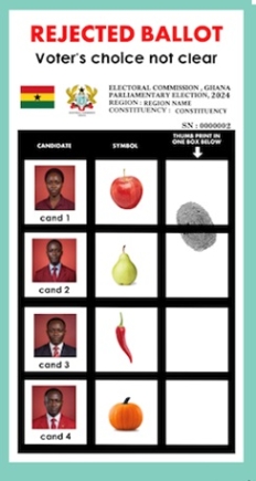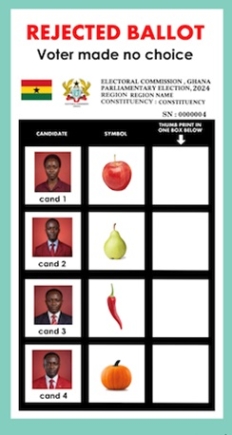 Rejected ballots are ballots cast by voters, which the presiding officer determines, while sorting the ballots at a polling station, to be void and, therefore, not counted for specified reasons as provided by law. There are five reasons why a ballot paper may be rejected.