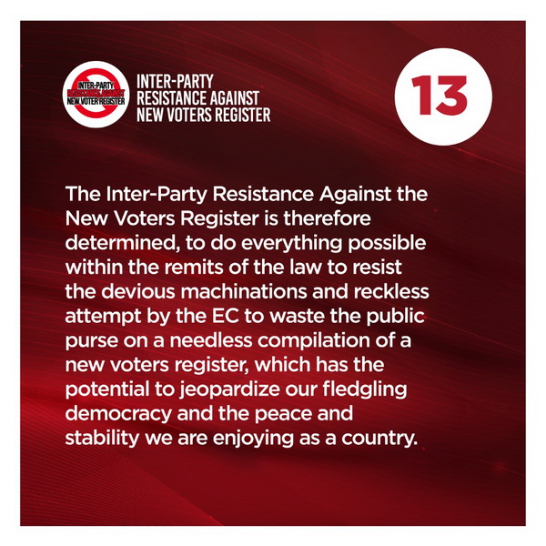 The Inter-Party Resistance Against the New Voters Register is therefore determined, to do everything possible within the remits of the law to resist the devious machinations and reckless attempt by the EC to waste the public purse on a needless compilation of a new voters register, which has the potential to jeopardize our fledgling democracy and the peace and stability we are enjoying as a country.