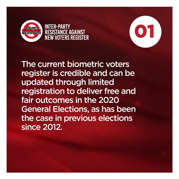 Before I proceed any further, let me refresh your memory on the reasons for our resistance against the EC’s decision to compile a new voters register. As you may be aware, the Inter-Party Resistance against the New Voters Register which is made up of six (6) Political Parties has always maintained that: