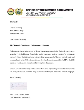 "Following the inconclusive re-run of the parliamentary primary in the Walewale constituency yesterday (with the Electoral Commission unable to declare a result as a result of an unfortunate incident), I have decided that in the interest of the greater good of the New Patriotic Party and peace and unity in the Walewale constituency, I will no longer be a candidate for MP in the 2024 elections. I am therefore formally withdrawing from the contest," she wrote.