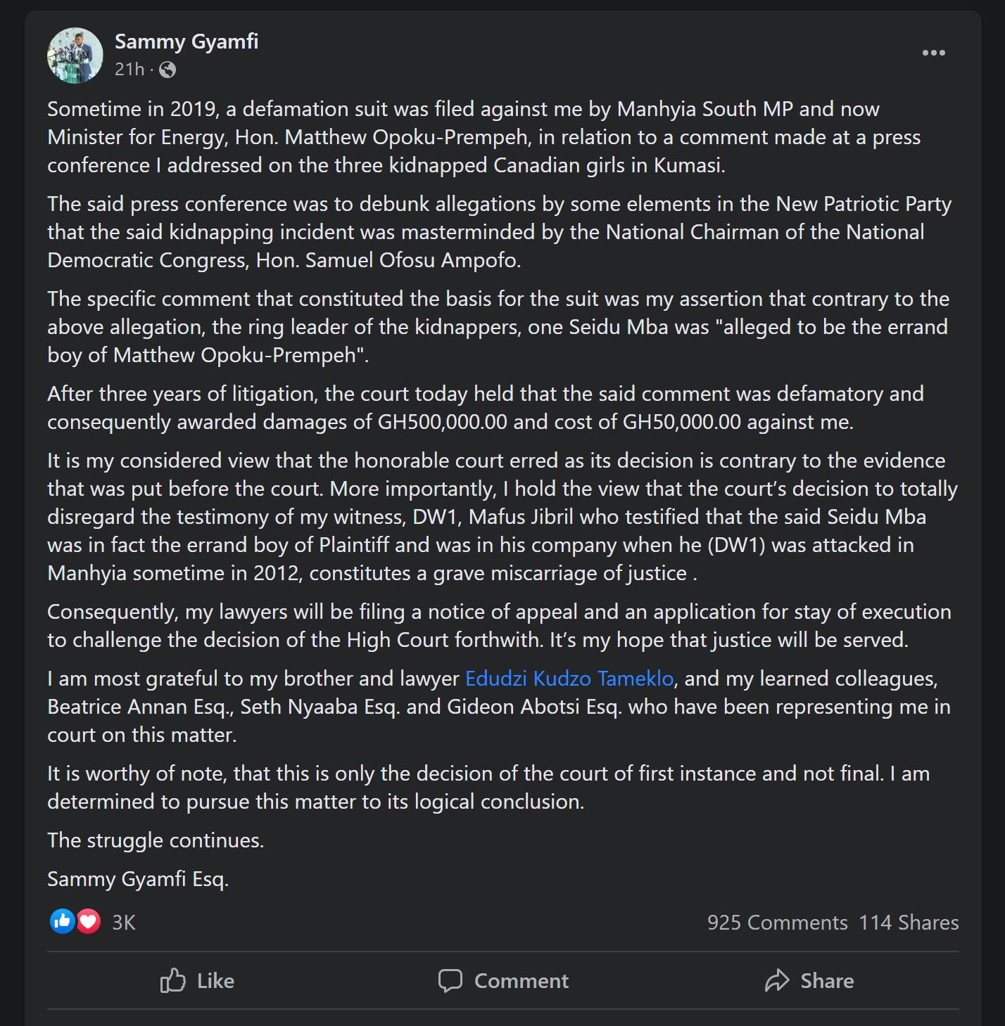 Aside from the costs and damages awarded by the court against him today, Mr Gyamfi has also been ordered to publish a retraction and an apology for his defamatory comments.In a Facebook post on Thursday, the spokesperson of the largest opposition party in the country said he was of the opinion that the court erred in its decision to rule against him.