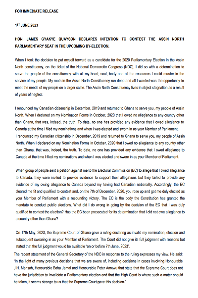 "Having made that point, let me make it clear to everyone that the most important thing to me right now is to contest and win the bye-election which is the result of what the Supreme Court announced on 17th May, 2023. I am determined to continue serving the good people of the Assin North with all my heart, soul, body and all the resources I can muster for the benefit of my constituents".