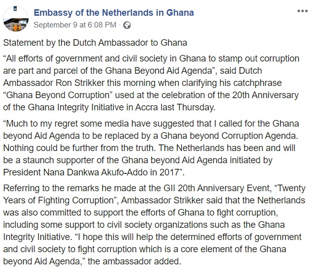 According to a statement issued by the Embassy of the Netherlands in Ghana, H.E. Strikker regrets that media reports suggested that he called for the Ghana Beyond Aid agenda to be replaced by a Ghana Beyond Corruption Agenda.