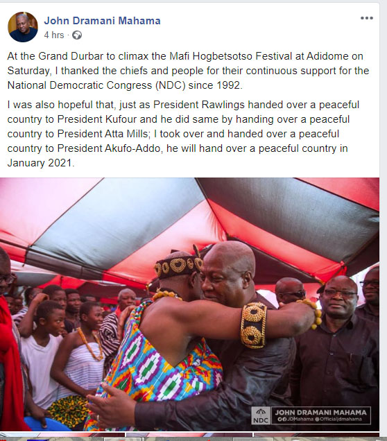 In a Facebook post on Monday morning [December 16, 2019], the former President said: ”At the Grand Durbar to climax the Mafi Hogbetsotso Festival at Adidome on Saturday, I thanked the chiefs and people for their continuous support for the National Democratic Congress (NDC) since 1992."