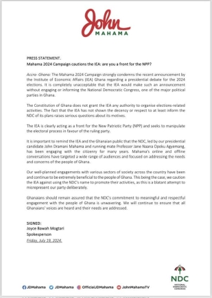 "It is completely unacceptable that the IEA would make such an announcement without engaging or informing the National Democratic Congress,one of the major political parties in Ghana," a statement dated Friday, July 19, 2024 and issued by Joyce Bawah Mogtari, Spokesperson for former President John Dramani Mahama said.
