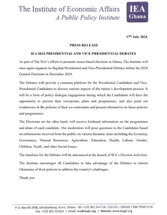 The Institute of Economic Affairs (IEA), Ghana says it will organise Presidential and Vice-Presidential debates ahead of the December 7, 2024 elections as part of efforts to promote issues-based elections in Ghana.