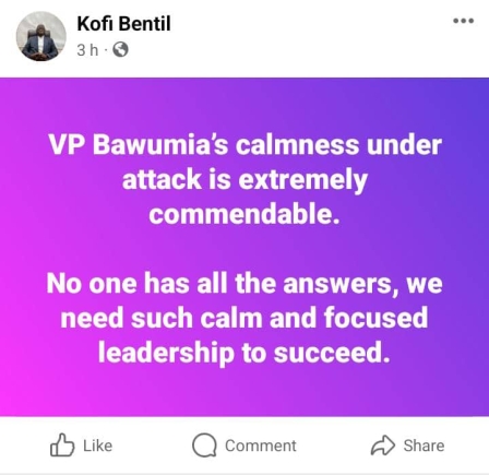 "VP Bawumia’s calmness under attack is extremely commendable," Kofi Bentil wrote in a post on Facebook.