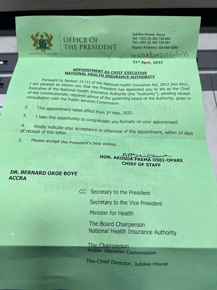 A letter from the Office of President, dated April 21, 2022, and signed by the Chief of Staff, Akosua Frema Osei-Opare congratulated Dr Okoe Boye for his appointment and asked him to indicate his acceptance or otherwise of the appointment within 14 days.