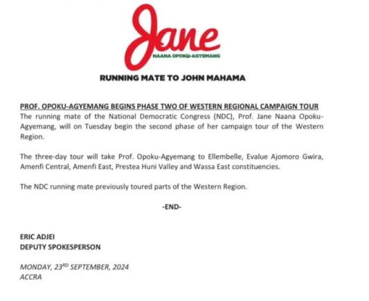 The vice presidential candidate of the National Democratic Congress (NDC), Professor Jane Naana Opoku-Agyemang started the second phase of her campaign tour of the Western Region on Tuesday, September 24.