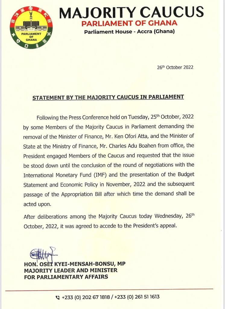 Following the Press Conference held on Tuesday, 25th October, 2022 by some Members of the Majority Caucus in Parliament demanding the removal of the Minister of Finance, Mr. Ken Ofori Atta, and the Minister of State at the Ministry of Finance, Mr. Charles Adu Boahen from office, the President engaged Members of the Caucus and requested that the issue be stood down until the conclusion of the round of negotiations with the International Monetary Fund (IMF) and the presentation of the Budget Statement and Economic Policy in November, 2022 and the subsequent passage of the Appropriation Bill after which time the demand shall be acted upon.