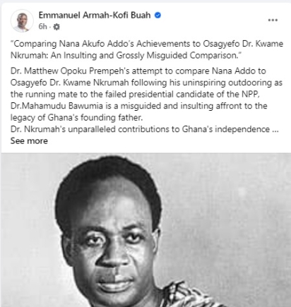 However, Mr. Buah expressed his disagreement with NAPO in a Facebook post, stating that Nkrumah’s "unparalleled contributions to Ghana’s independence and development are undeniable, and any attempt to draw comparisons with Nana Addo is unjust and illogical."