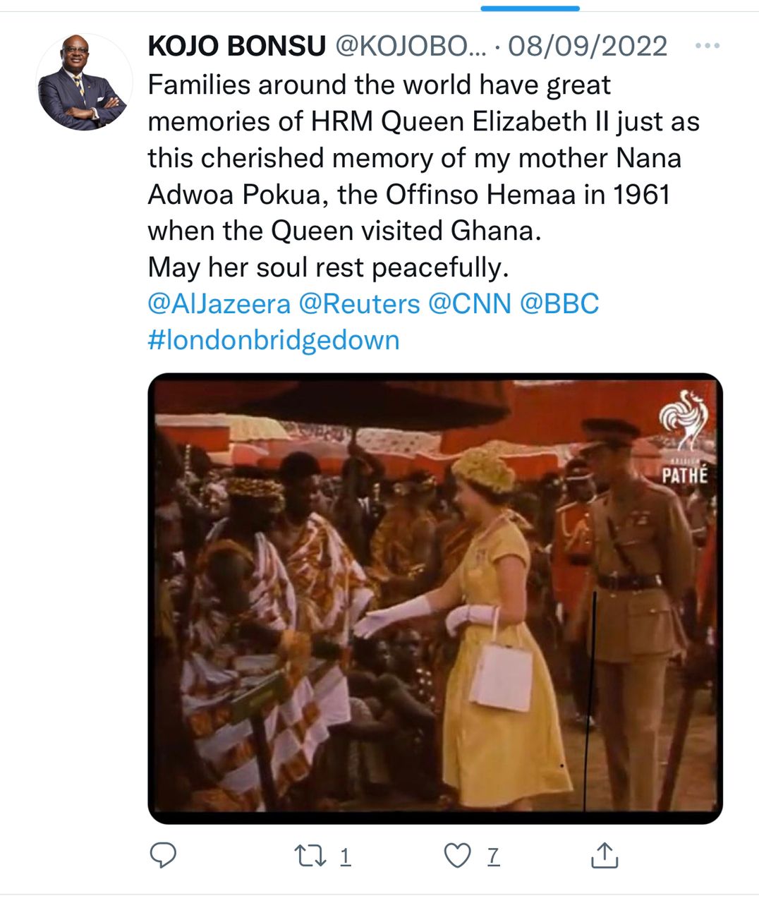 Mr Bonsu in a post later on social media shared a photograph in memory of the 1961 visit of HRM Queen Elizabeth II to Ghana with his mother, who was Queen Mother of the Offinso Traditional Area.