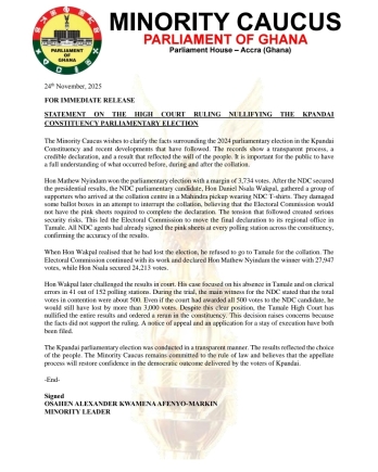 Reacting to the High Court in Tamale's ruling on Monday [Nov 24, 2025] that annulled the entire results of the 2024 Parliamentary election and ordered a rerun, the Minority Caucus, in a statement signed by its leader, Alexander Afenyo-Markin, expressed disagreement with the court ruling.