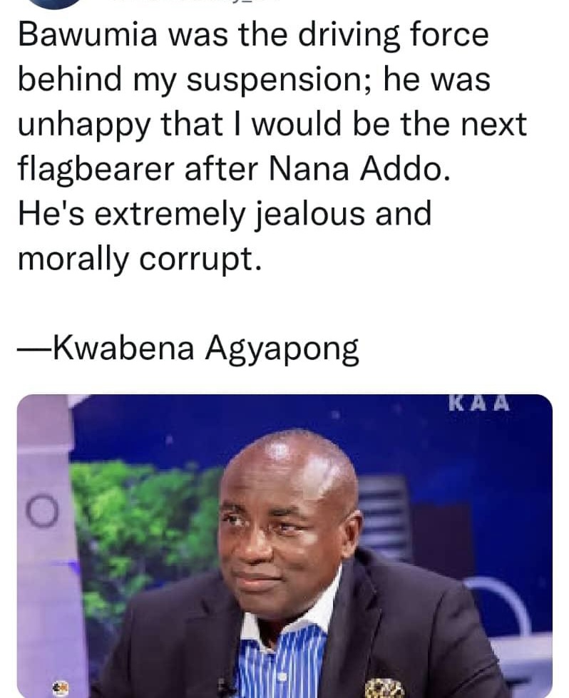 “Bawumia was the driving force behind my suspension; he was unhappy that I would be the next flagbearer after Nana Addo. He's extremely jealous and morally corrupt. - Kwabena Agyapong.