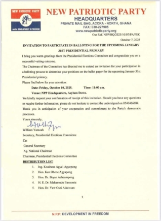 An invitation letter dated October 7, 2025, signed by the Secretary to the Presidential Elections Committee, William Yamoah and addressed to all five aspirants who have filed for the contest invited them to participate in the exercise, which will determine their positions on the ballot paper.