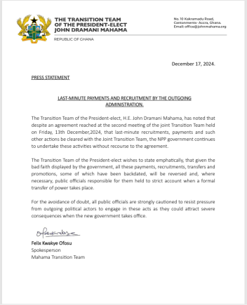 The statement, signed by Felix Kwakye Ofosu, spokesperson for the Mahama Transition Team, stressed that any last-minute payments, appointments, or promotions—some of which are said to have been backdated—will be reversed by the new administration.