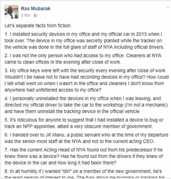 1. I installed security devices in my office and my official car in 2013 when I took over. The device in my office was secretly planted while the tracker on the vehicle was done in the full glare of staff of NYA including official drivers.