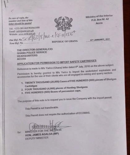Quoting from the letter, Mr. Nkrumah said the permit by the NDC granted the importer permission to import 20,000 cases of 500 pieces of shotgun cartridges, 4,000 pieces of hunting shotguns and 500 boxes of percussion caps.