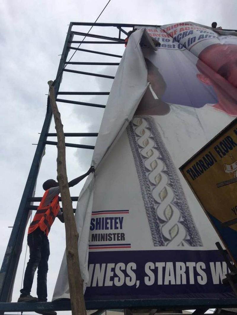 Some billboards in Accra that had the images of the Greater Accra Regional Minister, Mr Ishmael Ashitey and the Chief Executive of the Accra Metropolitan Assembly (AMA), Mr Mohammed Adjei Sowah, have been removed following backlash on social media.