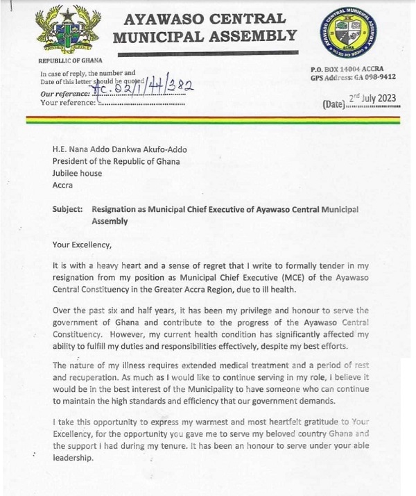 The Municipal Chief Executive (MCE) for Ayawaso Central, Mohammed Quaye, has resigned on health grounds.