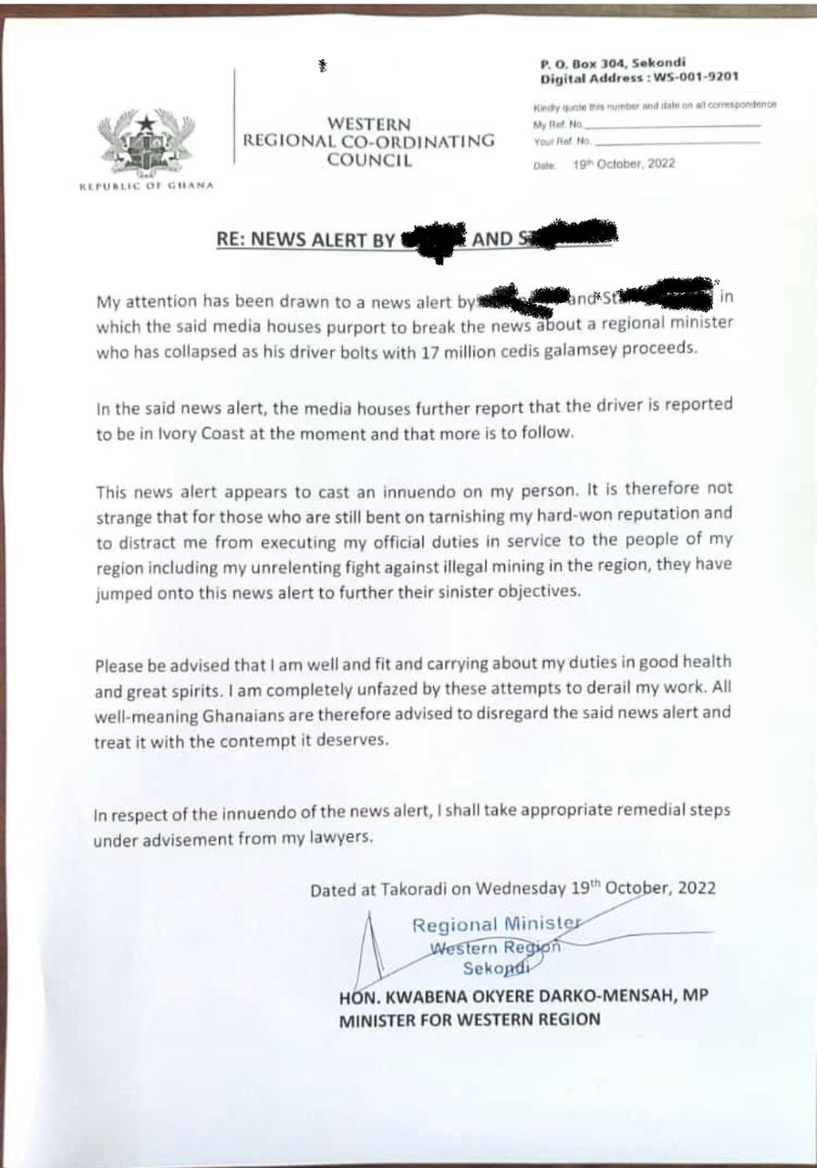 The Western Regional Minister, Kwabena Okyere Darko-Mensah, has reacted to an innuendo suggesting that a regional minister has collapsed after his driver reportedly bolted with his GH¢17million cash being proceeds from illegal mining (galamsey).