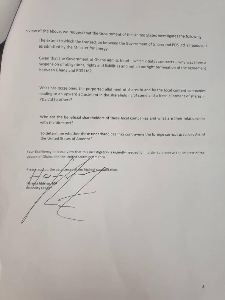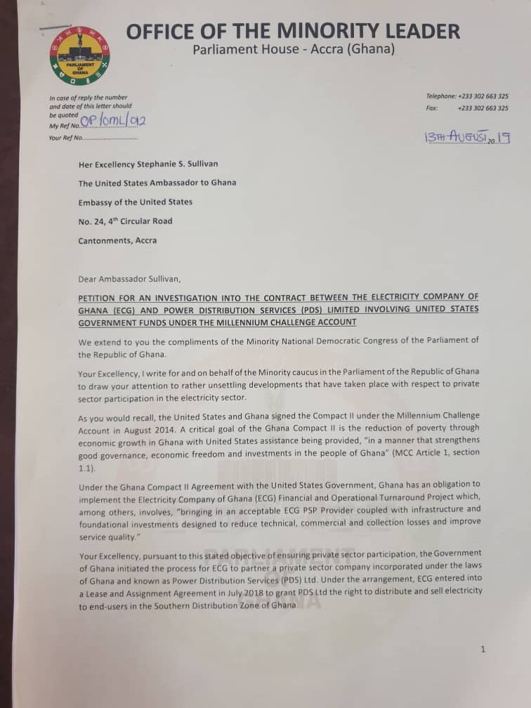 The Minority in Parliament has petitioned the United States government to help probe the Power Distribution Service (PDS) Ghana Limited saga.