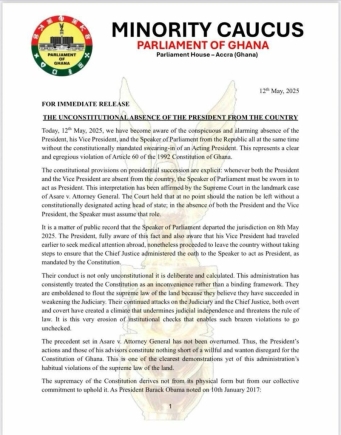 According to the Minority the Speaker of Parliament reportedly departed Ghana on May 8, 2025. The Vice President had travelled earlier for medical treatment abroad.