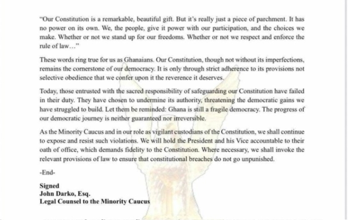 In a statement signed by John Darko, Legal Counsel to the Minority Caucus, the opposition lawmakers expressed alarm over what they called the "conspicuous and alarming absence" of the President, Vice President, Professor Jane Naana Opoku-Agyemang and the Speaker of Parliament, Alban Kingsford Sumana Bagbin from the country at the same time, in direct contravention of Article 60 of Ghana’s 1992 Constitution.