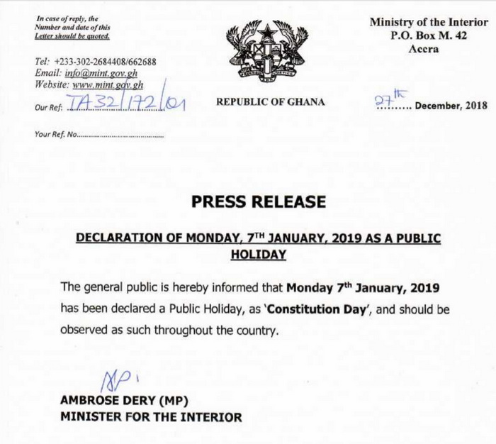 A terse statement signed by the Minister, Mr. Ambrose Dery, said the day has been christened “Constitution Day”.
