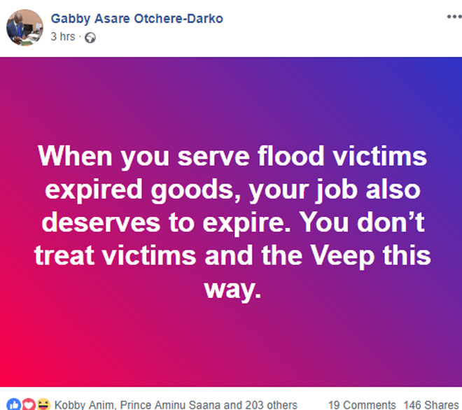 He posted on Facebook: "When you serve flood victims expired goods, your job also deserves to expire. You don’t treat victims and the
