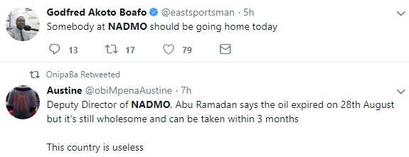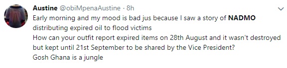 NADMO has already initiated a move to immediately withdraw the expired cooking oil and supply the flood victims with new ones.