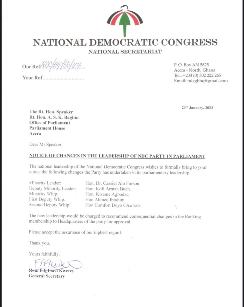 The party in a letter dated January 23, 2023 and addressed to the Speaker of Parliament informed Parliament about the changes.