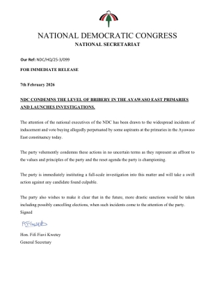 The National Democratic Congress (NDC) has condemned alleged incidents of bribery and vote-buying during its parliamentary primary in the Ayawaso East constituency on Saturday, February 7, 2026.