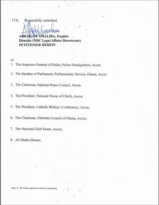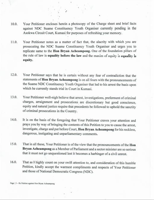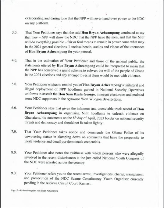 The petition contained audio and video footage of Acheampong's statements, which the NDC believes could be interpreted as the NPP intending to use violence to maintain power in the 2024 general elections.