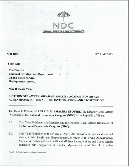 The legal team of the National Democratic Congress (NDC) has petitioned the Criminal Investigation Department (CID) of the Ghana Police Service to arrest and prosecute the Member of Parliament for Abetifi and Minister for Food and Agriculture, Bryan Acheampong.