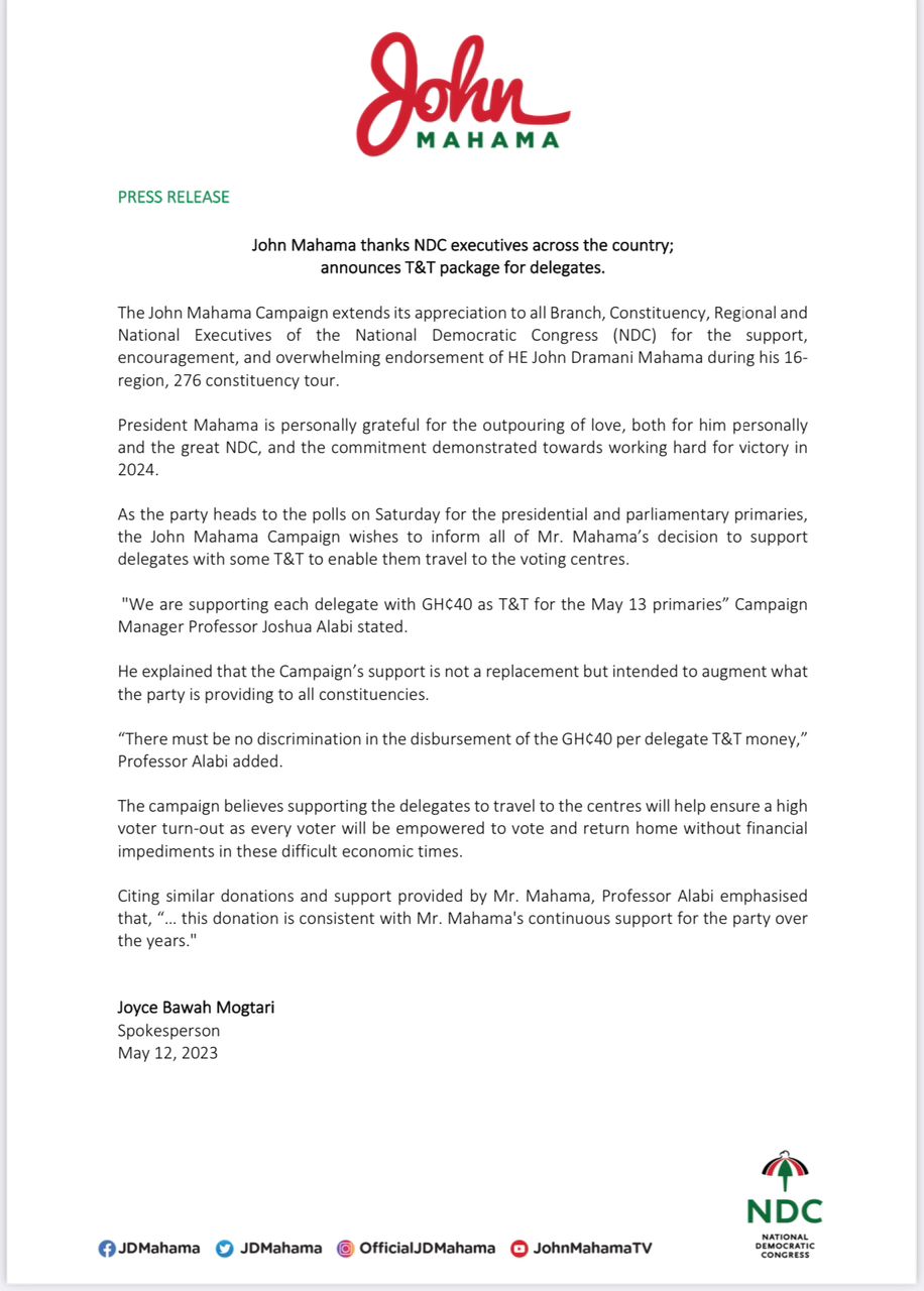 "As the party heads to the polls on Saturday for the presidential and parliamentary primaries, the John Mahama Campaign wishes to inform all of Mr Mahama's decision to support delegates with some T&T to enable them travel to the voting centres, a statement signed and issued by the Spokeperson of Mr Mahama, Joyce Bawah Mogtari, said.