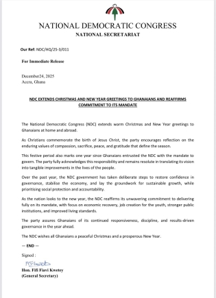 The governing National Democratic Congress (NDC) has expressed appreciation to Ghanaians for the trust placed in the party and reaffirmed its commitment to delivering on its mandate as the nation celebrates Christmas and prepares for the New Year.