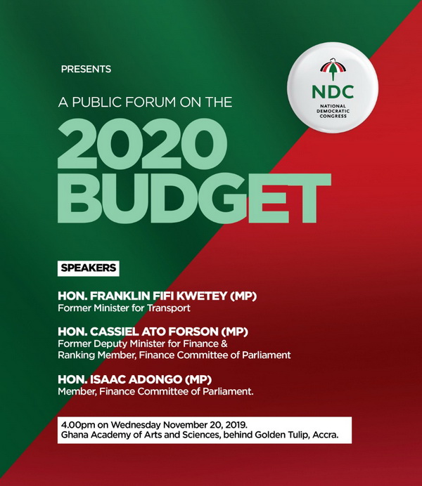 The National Democratic Congress (NDC) says it will hold a Public Forum on the 2020 Budget Statement and Financial Estimates on Wednesday, November 20, 2019.