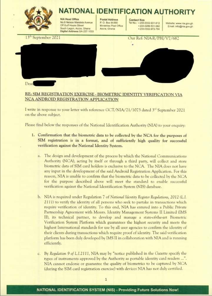 Below is a copy of the NIA's letter to the Ghana Chamber of Telecommunications on the issue which was leaked