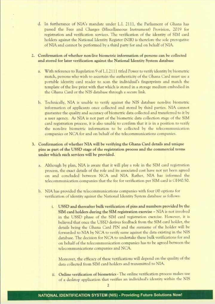In the letter dated September 13, 2021, NIA responded to three key issues, one of which was to confirm whether or not “the biometric data to be collected by the NCA for the purpose of SIM registration is in a format, and of sufficiently high quality for successful verification against the National Identity System”. The NIA answered in the negative.
