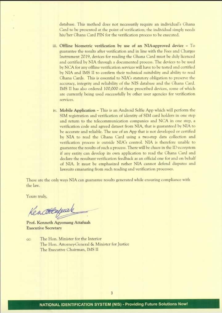 The said letter, the statement explained, was a response from the Executive Secretary of the NIA, Prof Kenneth Agyemang Attafuah, to some technical clarification from the Ghana Chamber of Telecommunications (GCT) on the potential interface between the National Identification System (NIS) and the planned SIM registration exercise.
